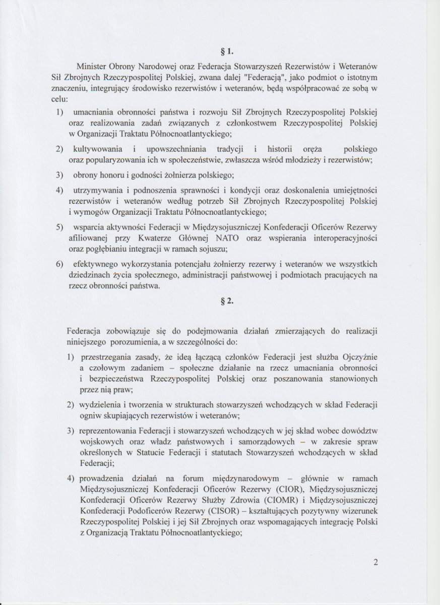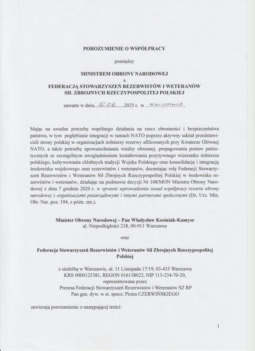 12 czerwca 2025 roku wicepremier, minister Obrony Narodowej Pan Władysław KOSINIAK-KAMYSZ podpisał porozumienie z Federacją Stowarzyszeń Rezerwistów i Weteranów Sił Zbrojnych Rzeczypospolitej Polskiej.