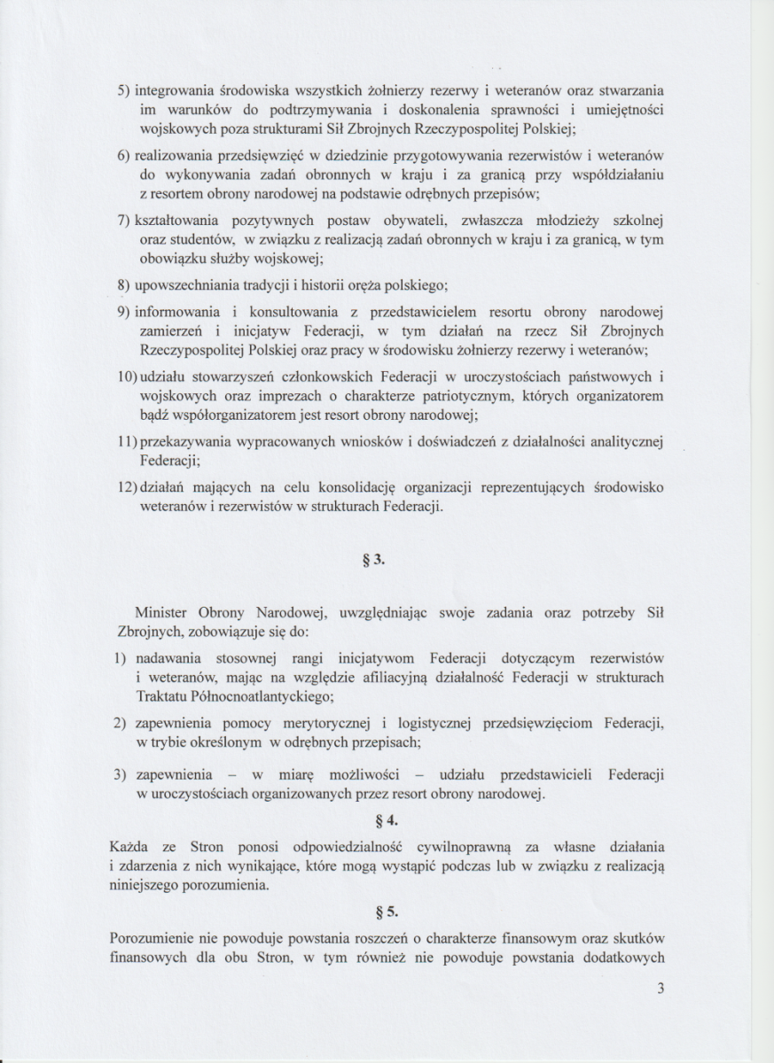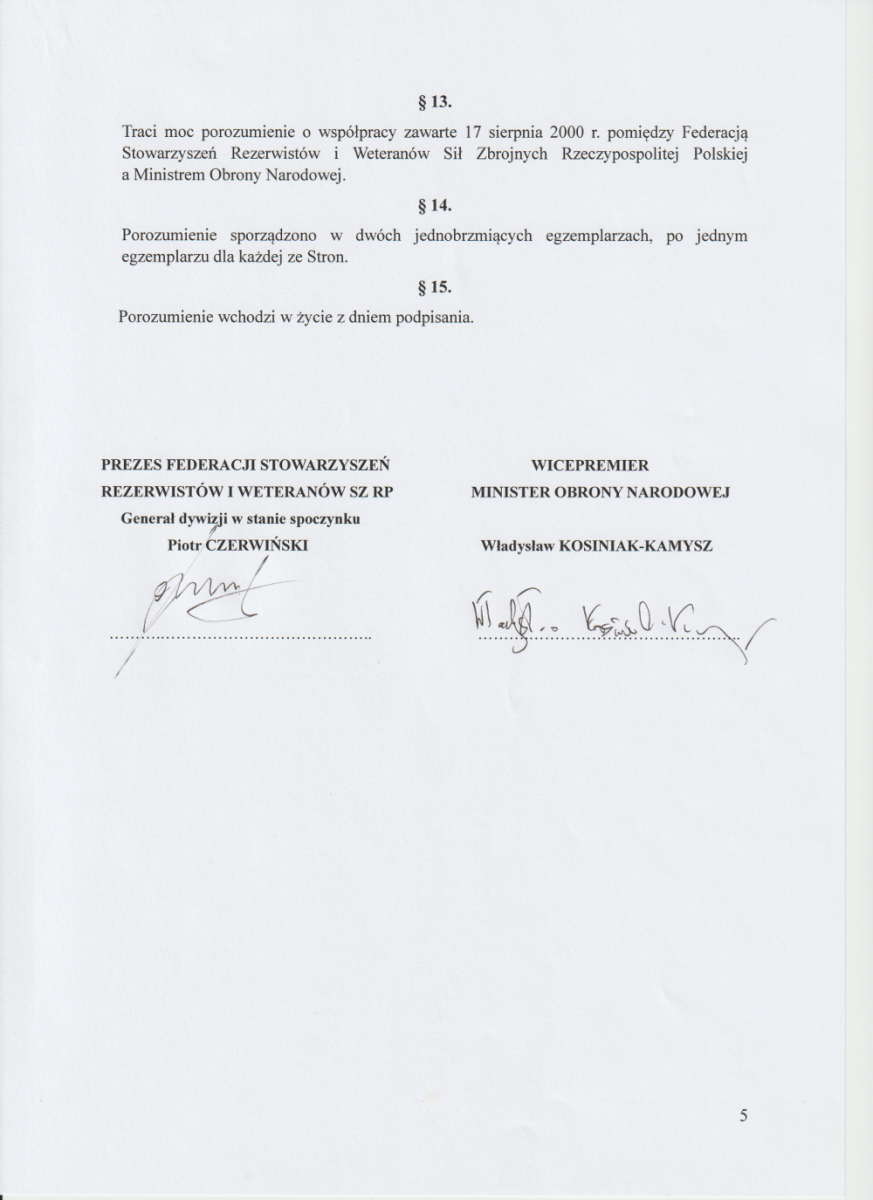W imieniu Federacji porozumienie podpisał jej Prezes – gen. dyw. w st. spocz. Piotr CZERWIŃSKI.